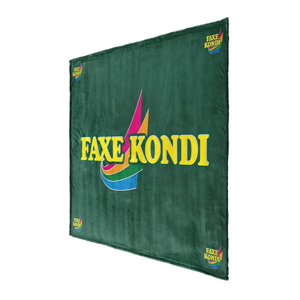 Produceret miljørigtigt i grøn, recycled polyester fleece i en rigtig lækker kvalitet og anti-fnug effekt. Tæppet er dekoreret med det legendariske Faxe Kondi logo i stor udgave i midten og små logoer i hjørnerne.