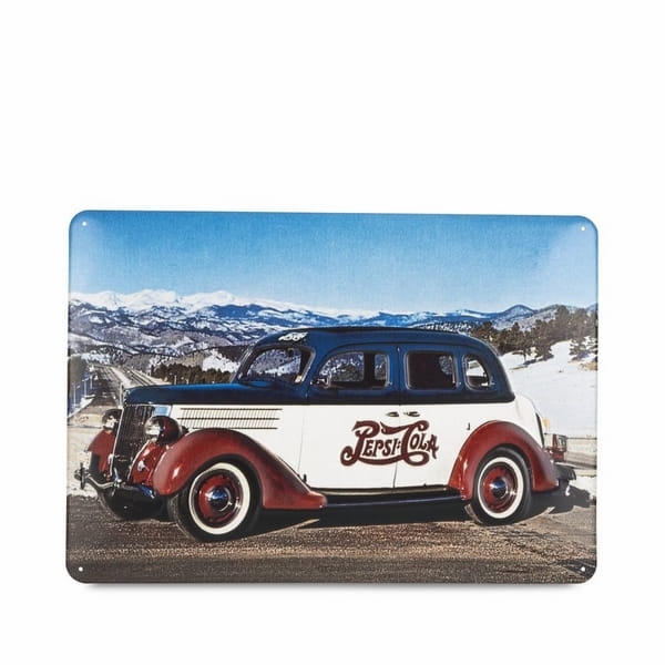 Originalt Pepsi retro metalskilt med flot motiv af veteranbil med Pepsi Cola branding - lige til at hænge op i hjemmebaren, herreværelset, garagen eller den amerikanske diner.