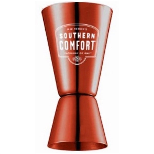 Southern Comfort Jigger målebæger i rustfrit stål, lakeret i en flot, metalrød farve med det klassiske Southern Comfort trykt i hvid.